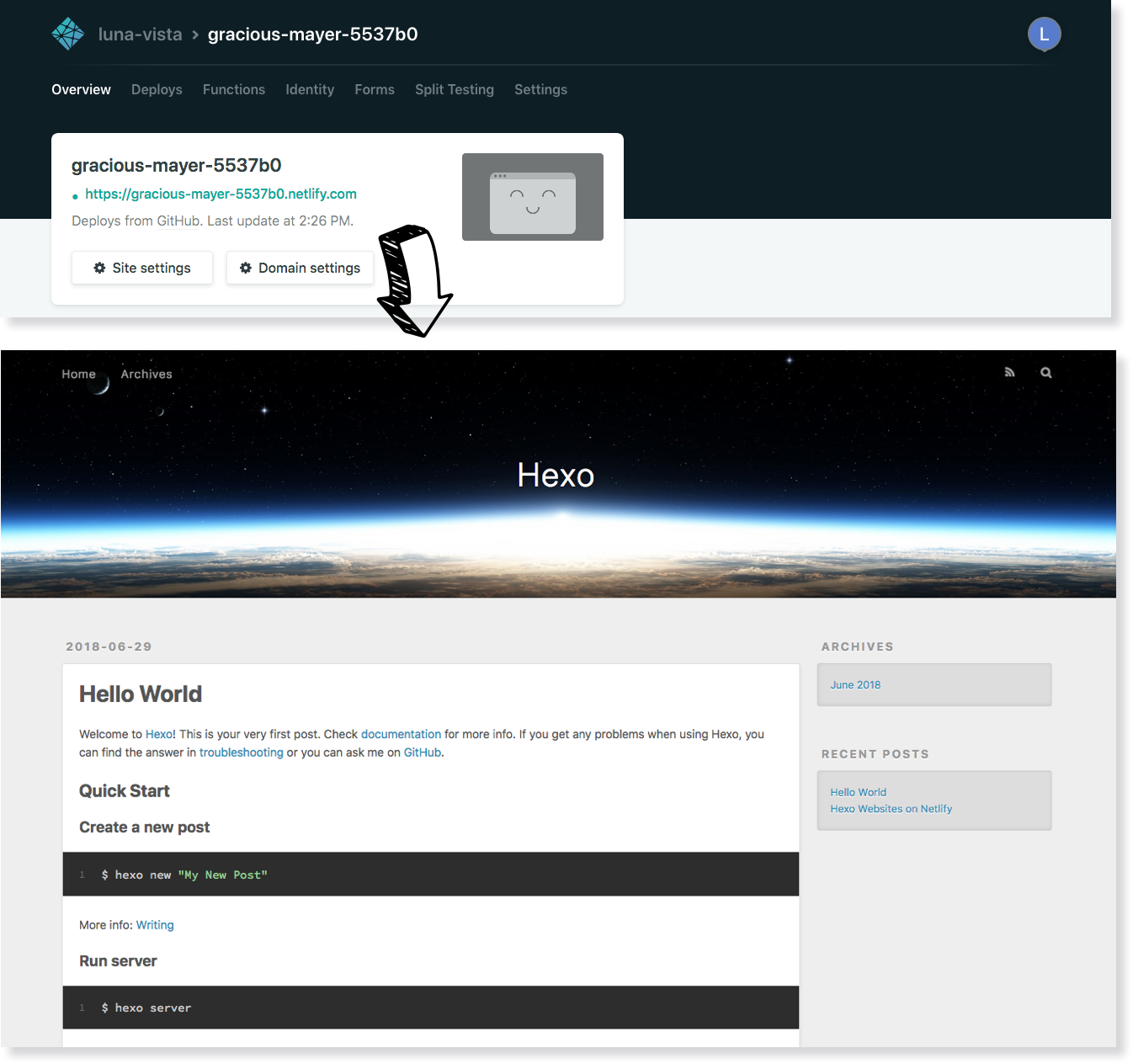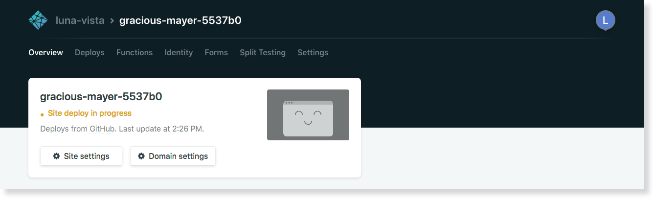 Wait, you thought there was going to be more? Nope! Netlify has done it all for you, including giving your site a temporary name. Let's make it look a little prettier. Go to _Domain settings > Edit site name_: