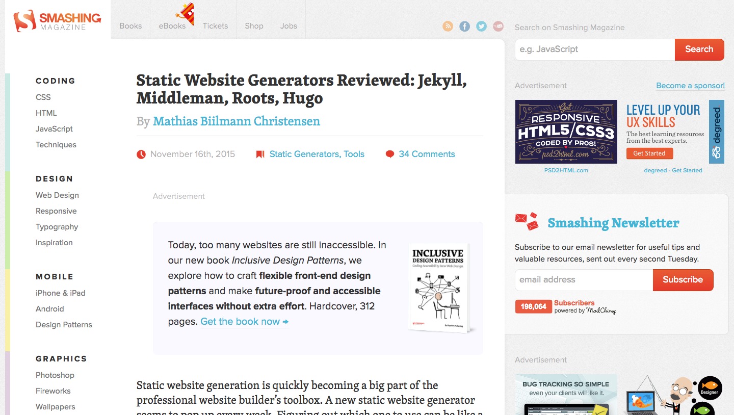 Read Full Article on Smashing Our CEO Matt Biilmann compares 5 modern site generators; Hugo, Jekyll, Middleman & Roots.