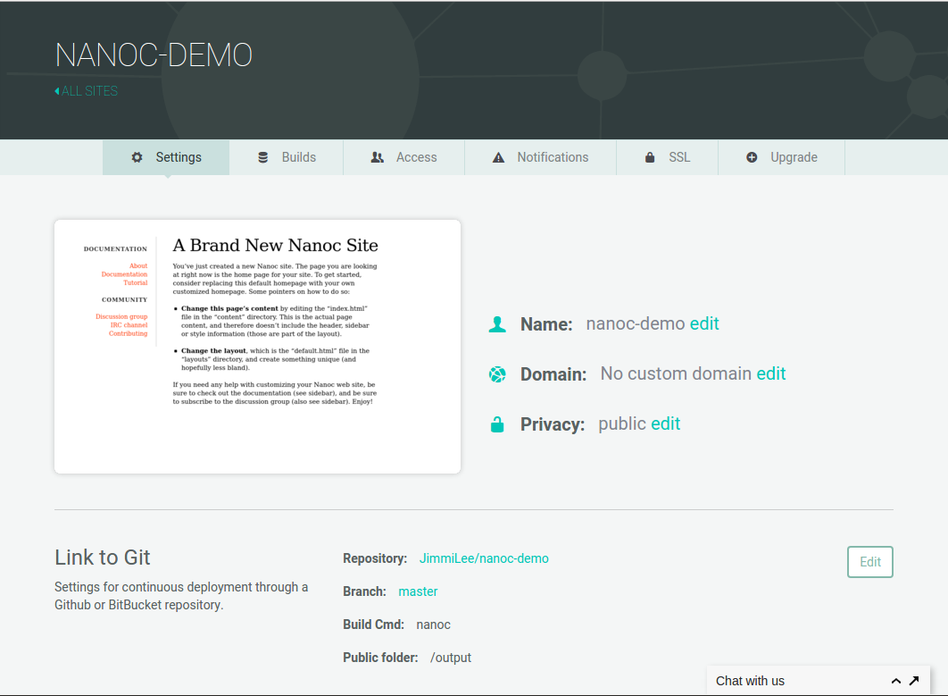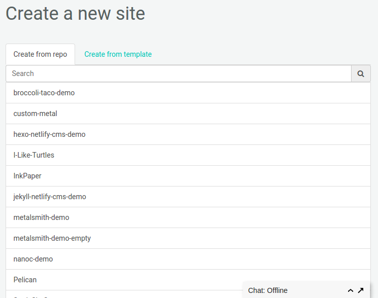 For the purpose of this tutorial we’ll select the “nanoc-demo” repo we just pushed to GitHub.