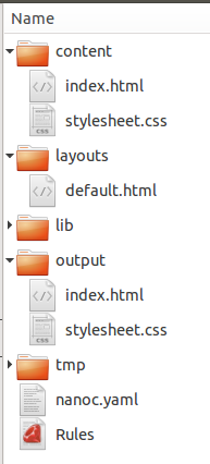 Of the files, its worth noting that nanoc.yaml contains site-wide configuration details and that the Rules file is used by Ruby to describe how pages and assets will be processed.