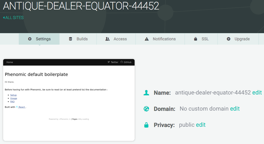 And…you’re done! Netlify has done it all for you, including giving your site a temporary name. Now you can add your custom domain, and your site will be live for your adoring public to view. Congratulations, and thanks for using Netlify!