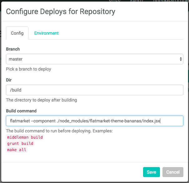 Here you can configure your options. Make sure that /build is the directory you want to deploy, and enter flatmarket --component ./node_modules/flatmarket-theme-bananas/index.jsx as your build command.