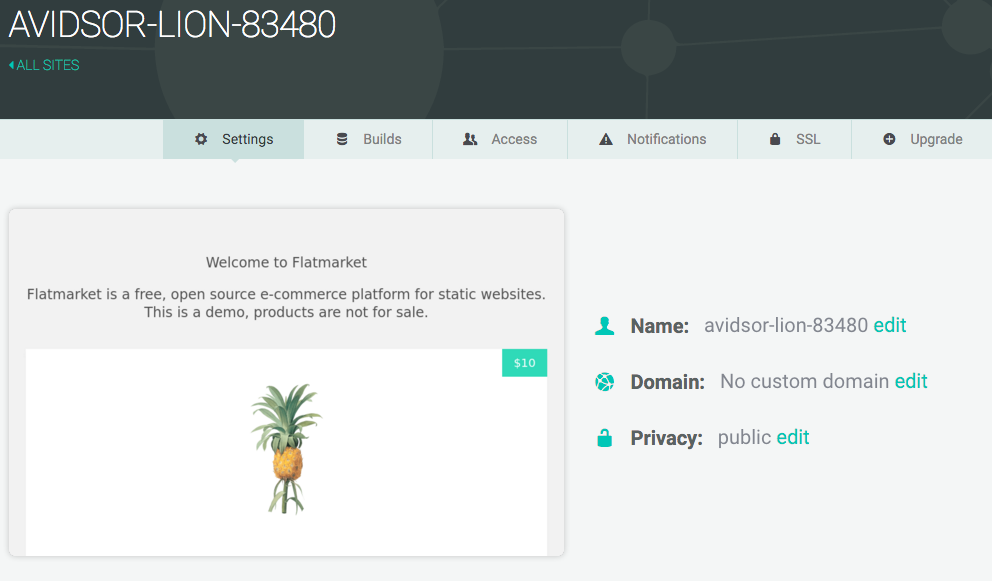 Now you can visit the site at https://flatmarket-example.netlify.com. Note the https. Any Netlify site without a custom domain can use Netlify’s SSL, just by specifying https in the URL.