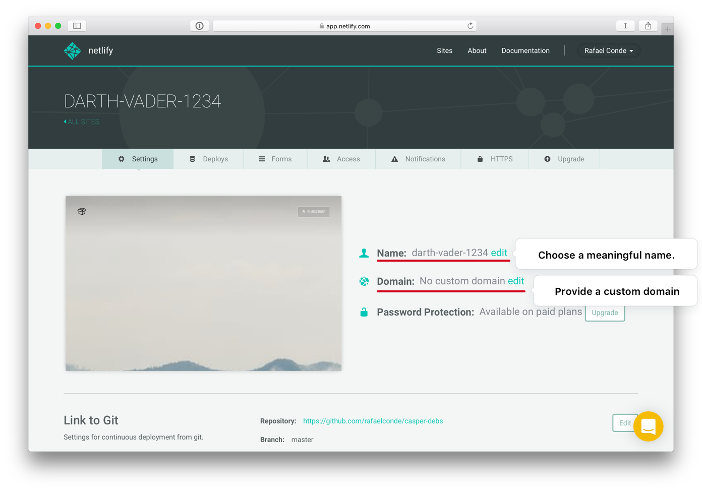 - (Optional) Set up notifications/integrations, invite collaborators. These are not required features, but if you use Slack or want to trigger builds or notifications by webhook or email, or are working with some collaborators, now’s a great time to get them setup. These are both tabs on the main settings page, ‘Notifications’ and ‘Access’ respectively. Inviting others to collaborate will mean that they can change your site’s configuration but isn’t needed for people to browse your site — anyone can do that. For more information about Notifications, check out: