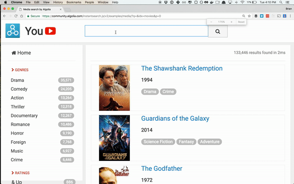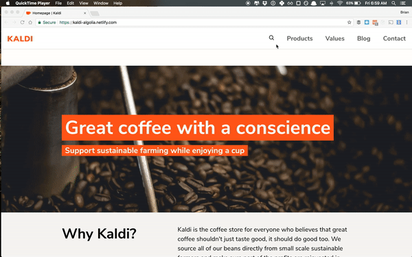 If you are interested in trying our Algolia search on a project or simply looking to take a closer look, check out their InstantSearch.js examples. You can also clone your own version of our gulp indexing solution with my Kaldi template to get the full experience.