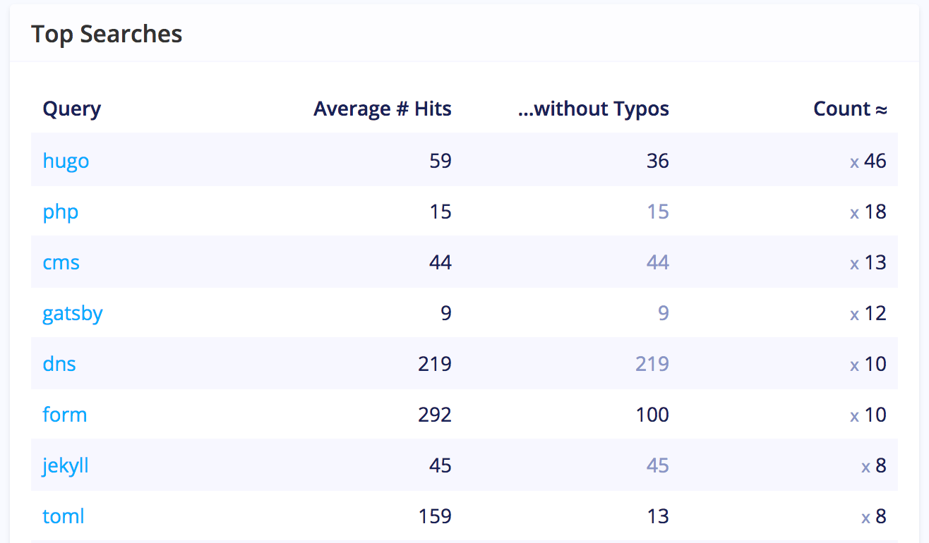 The switch to Algolia was trivial and came with other features like search analytics, where I can see the most common searches that return 0 results, a cool metric that lets us know how if there is content that the site is not providing that users expect. I can also see the top searches and now see there is indeed a need for more Hugo content ;)
