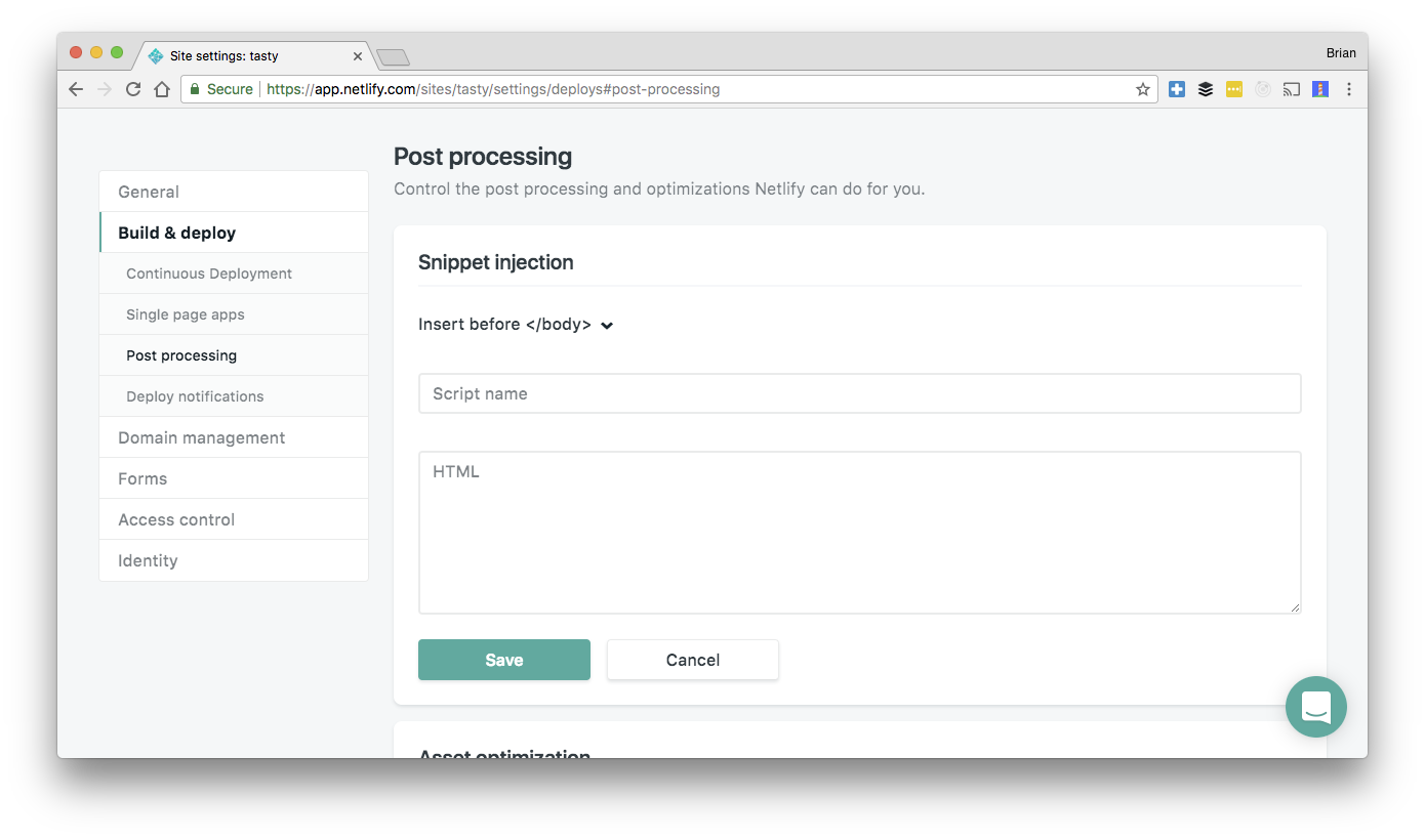 <script src="https://identity.netlify.com/v1/netlify-identity-widget.js"></script>You can add this to your sites index.html, but my recommendation is to add it to the site dashboard, using Netlify feature to add snippet injection. You find the snippet injection form in your site settings under the build & deploys menu.