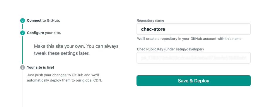 Click the Connect to GitHub button, name your repository and enter in this public key in the “Chec Public Key” input. Please note that for the purpose of getting you up and running with a live deploy preview of the demo store, we provided you with the Public Key from our demo merchant account. Now, save & deploy your site.