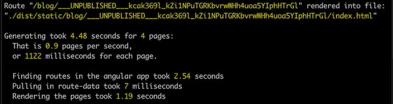 The slugs listed here is how we can create different routes to this post, since blog/:slug was added to the Scully config (when we generated the blog skeleton). We can assign many and anything (as long as it’s valid url syntax) to slugs to make a new route. In the generated example there is a random, ludicrous route that would be hard to stumble upon. This is made so that before you publish a post you can share a link, like https://jamstack-angular-blog.netlify.app/blog/___unpublished___kccbnalf_mp0v7nfncfdagu2vtdhssrwzr2gxxvbl, with reviewers but your general audience can’t easily find it.