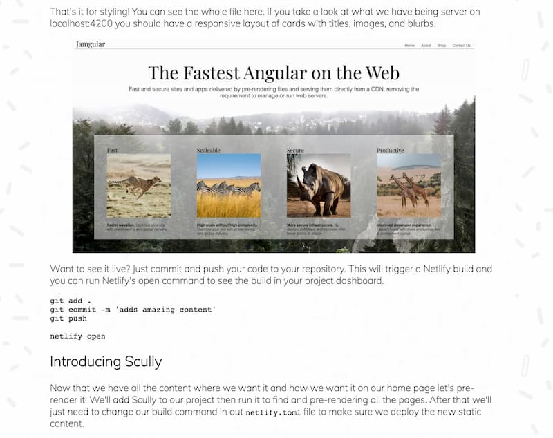 +.blog-post li {+ list-style-type: disc;+If you still have jam-it running you may see these style changes. Always try canceling Scully serve (with Ctrl + c) and re-running jam-it if something that should be showing, isn’t. Our blog posts now look like this: