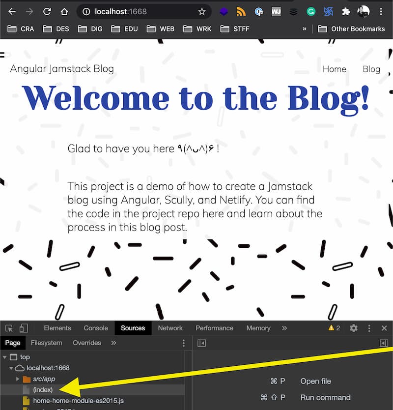 { "name": "angular-jamstack-blog", "version": "0.0.0", "scripts": { "ng": "ng", "start": "ng serve", "build": "ng build", "test": "ng test", "lint": "ng lint", "e2e": "ng e2e", "scully": "scully", "scully:serve": "scully serve",+ "jam-it": "ng build && npm run scully -- --scanRoutes && npm run scully serve" }This jam-it script will run the build, run Scully with the scanRoutes option to look for new routes, and run the serve option so we can see the pre-rendered content at localhost:1668. If we look at the Sources tab in Developer Tools when we run npm run jam-it, we can see it’s serving the html file.