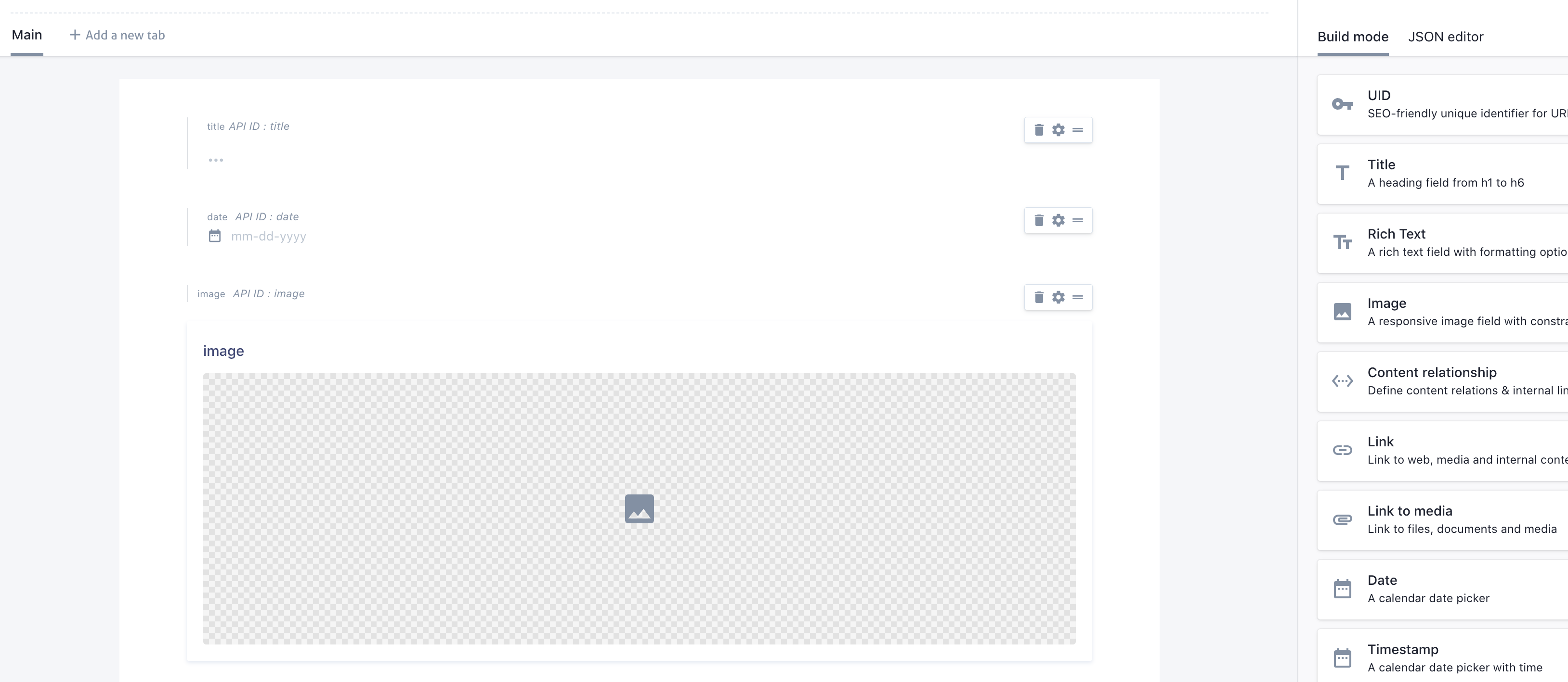 Once you create that type, you can add whatever fields you’d like. I added a Title, Date, and Image: