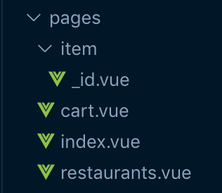 When creating dynamic pages in Nuxt, you’ll create a directory with an underscore of the unique identifier you’ll be using to associate the page, I typically use an id. So my pages directory would look like this: