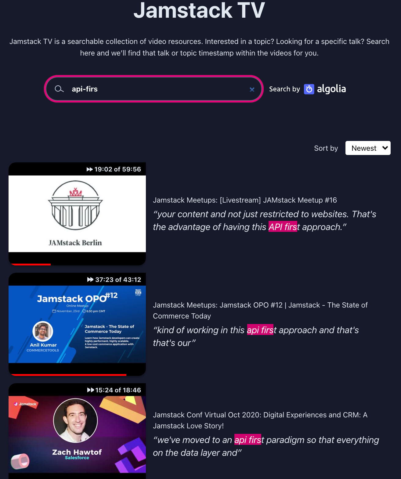 While these standard techniques are indeed important, there’s a missing resource: How about searching the content itself? Algolia recently partnered with Netlify to do exactly this: create an in-video search for Jamstack TV, where users can find videos from the Jamstack conferences (as well as other videos) by typing in words used by the speakers or narrators in the video.