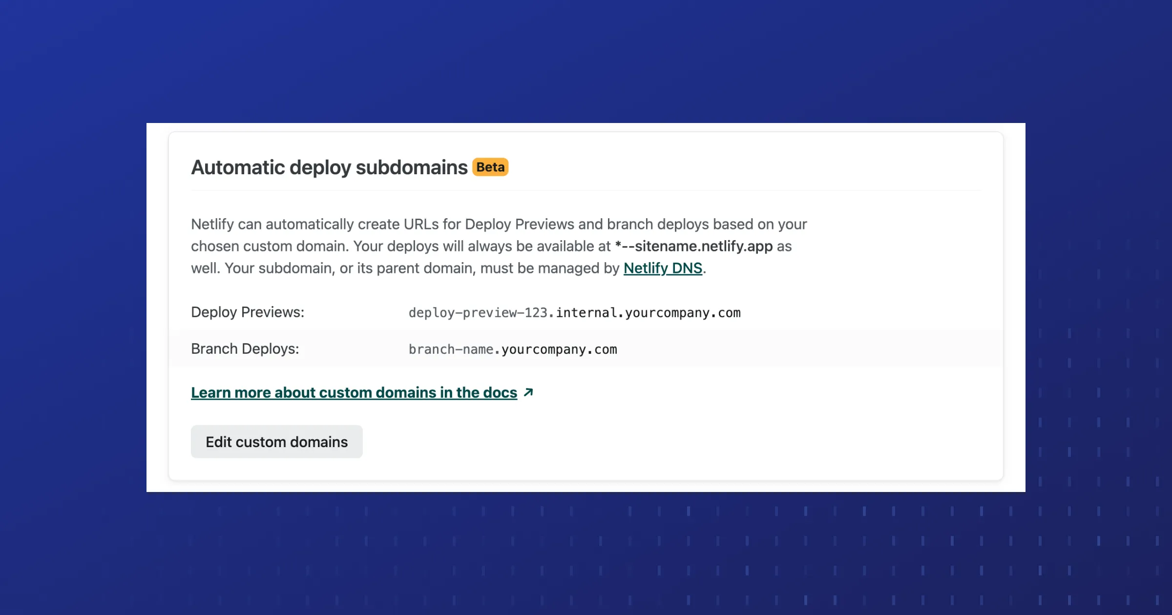 Automatic deploy subdomains are now generally available for all Netlify customers with a Pro plan or above! You can set a custom domain for your Deploy Previews and/or branch deploys, and Netlify will automatically generate and link to these URLs for these deploy contexts.