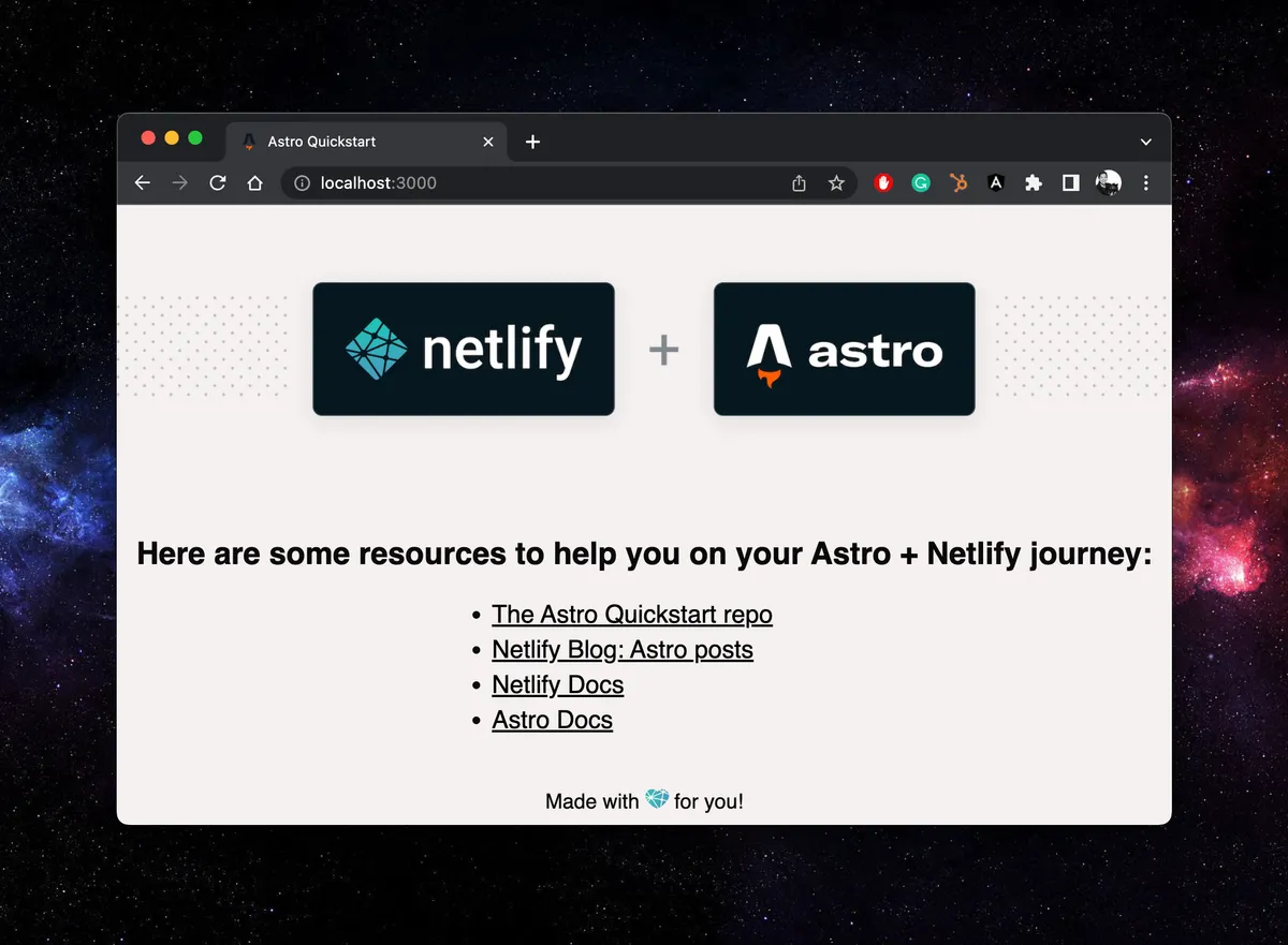 With a couple clicks and a few keystrokes you have an Astro site and it’s deployed for all the world to see. We’re excited to see what you create! Have an idea for another quickstart template? Let us know templates@netlify.com. Happy coding 👩🏻💻!