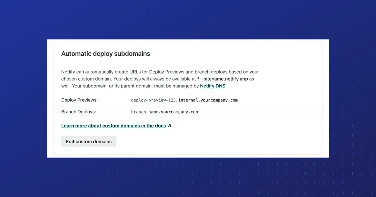 Choose a custom domain for your Deploy Previews and/or branch deploys. Netlify will automatically generate custom preview subdomains for you.